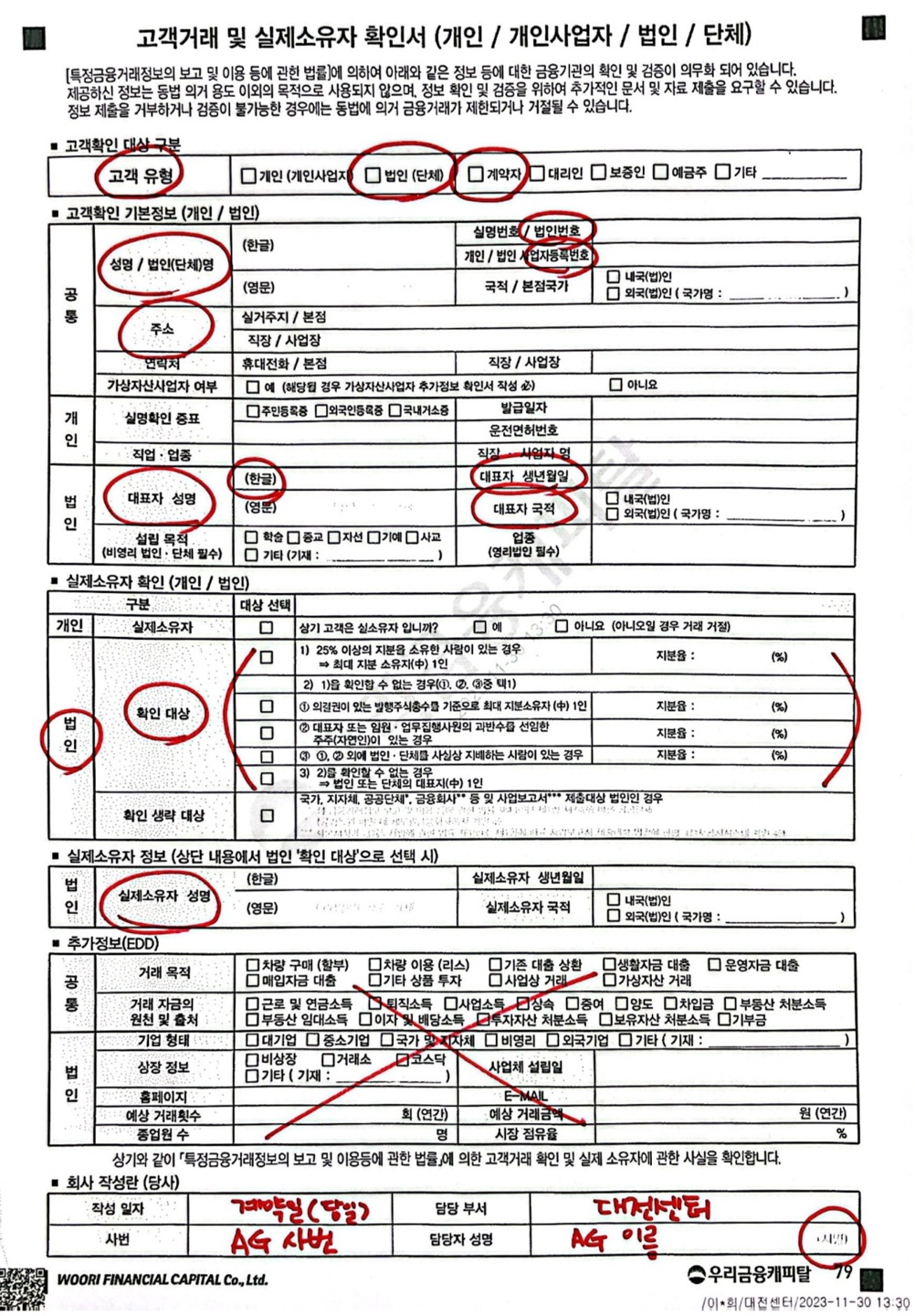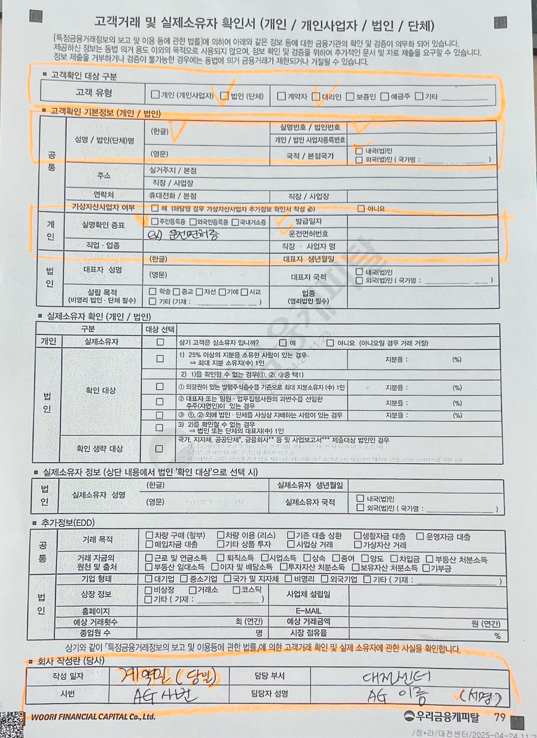 리스/ 할부 상품 진행 시 보증인면제로 ⭐법인담당자⭐ 지정 되시는 경우 대리인에 대한 고객확인 필수 사항으로 ⭐고객거래 및 실제소유자확인서⭐ 징구대상입니다. 위 사진 참고하시어 대출실행 접수 시 작성 부탁드립니다.