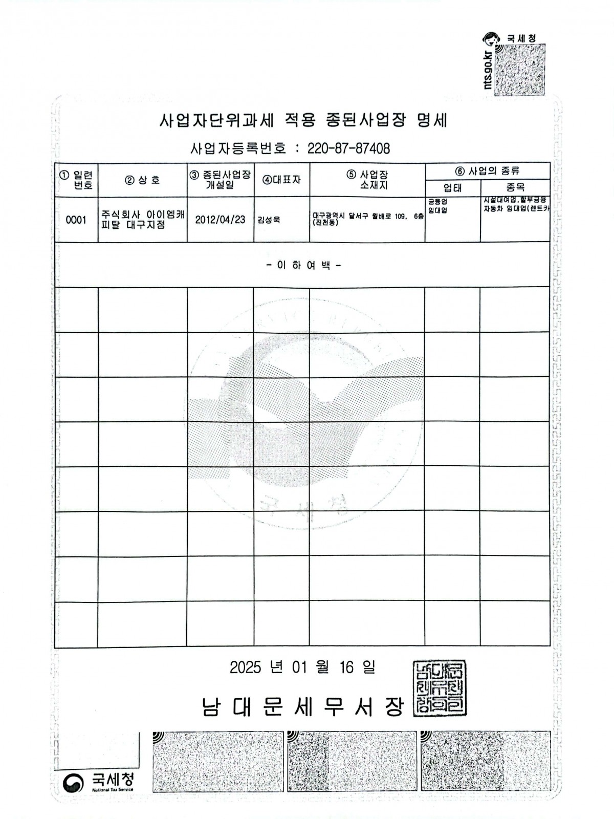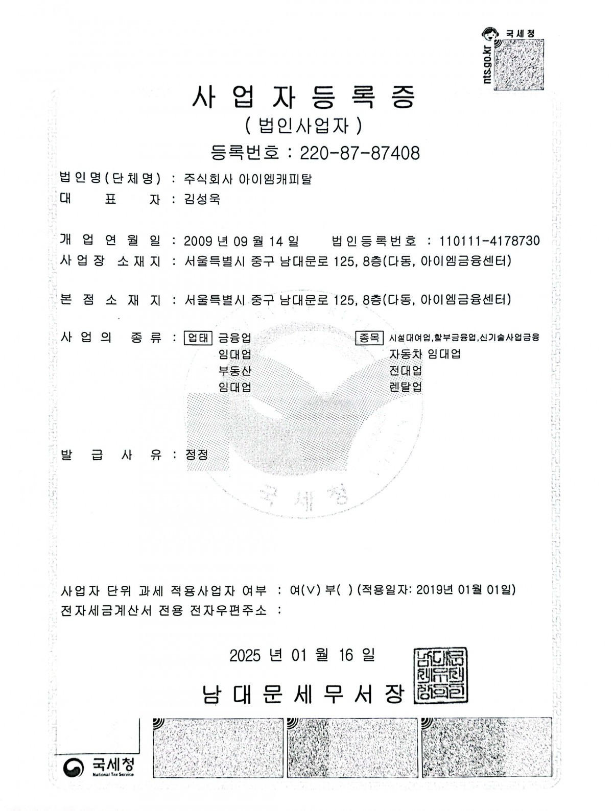 IM 캐피탈 사업자등록증 및 법인등기부등본