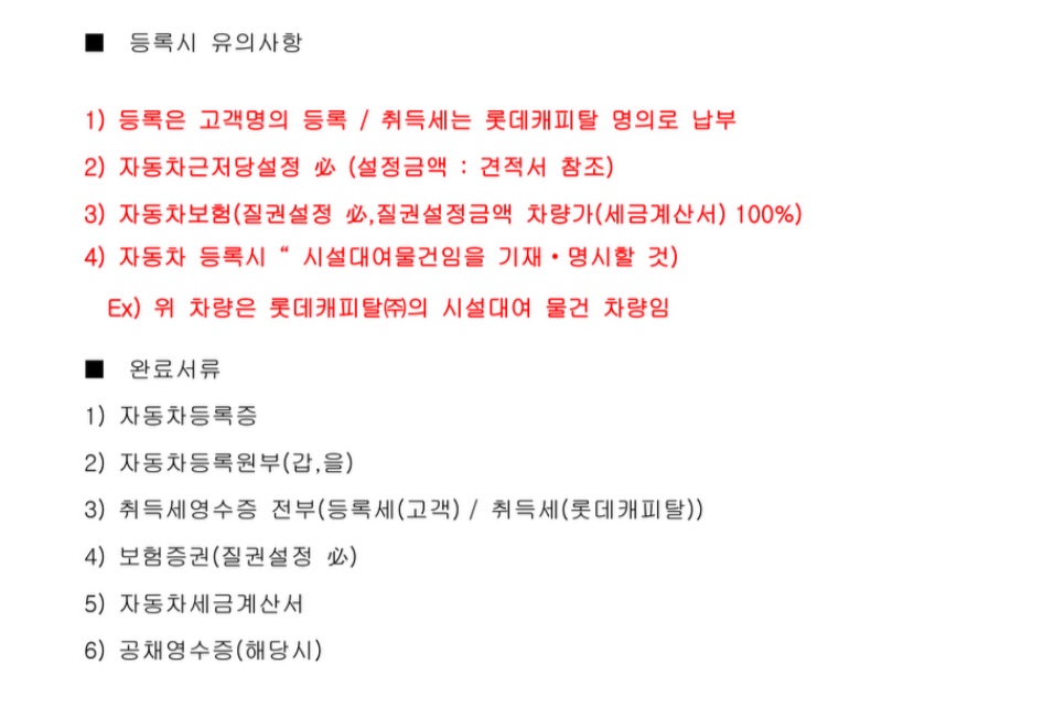 롯데캐피탈 이용자 명의 리스 등록시 유의사항입니다.