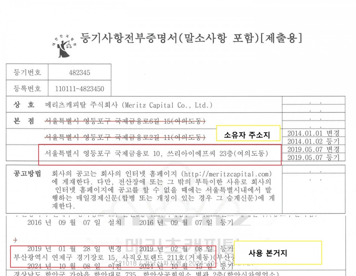 메리츠 캐피탈 사용본거지와 등록지 주소입니다.