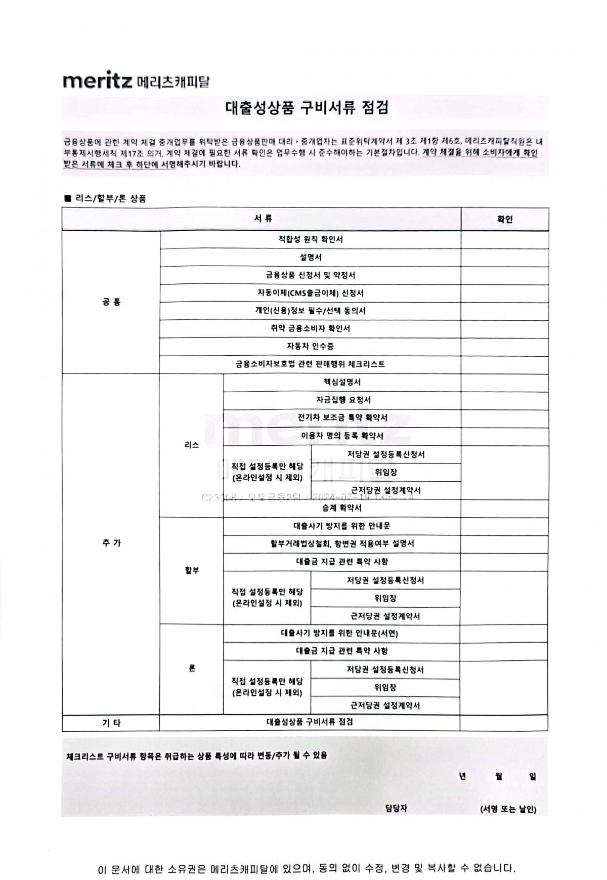 메리츠 캐피탈 대출성상품 구비서류 점검표입니다.