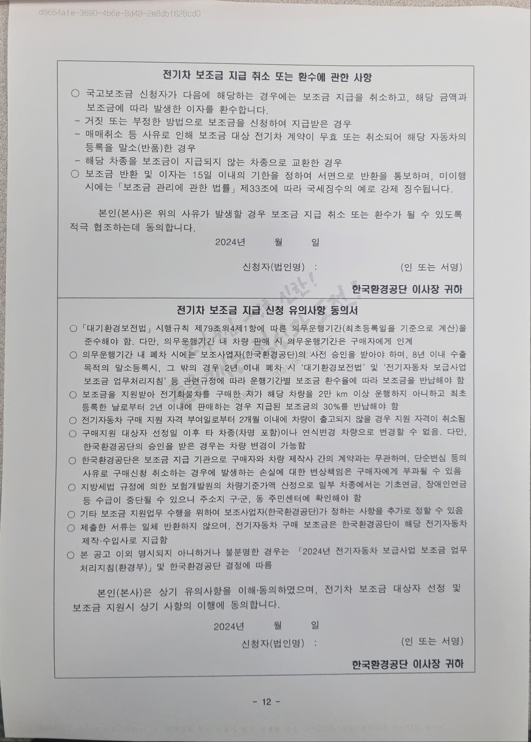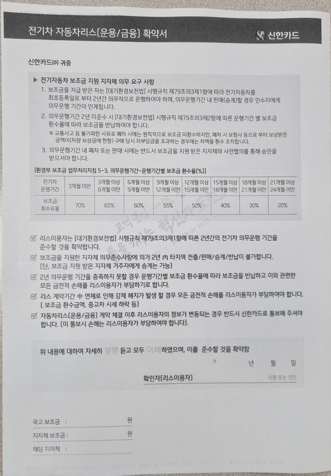 신한카드(리스) 전기자동차 구매 지원신청서(법인), 전기차 자동차리스 확약서입니다