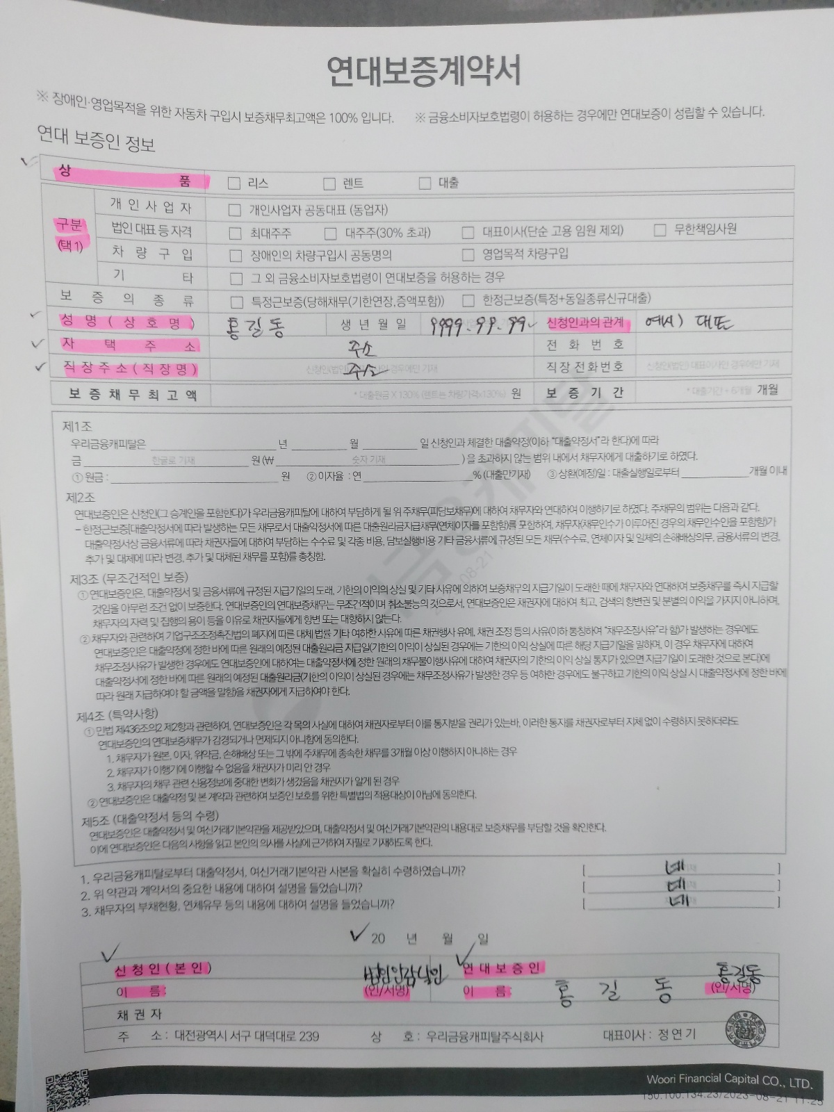 우리금융캐피탈 연대보증인 입보시 필요서류 안내입니다.