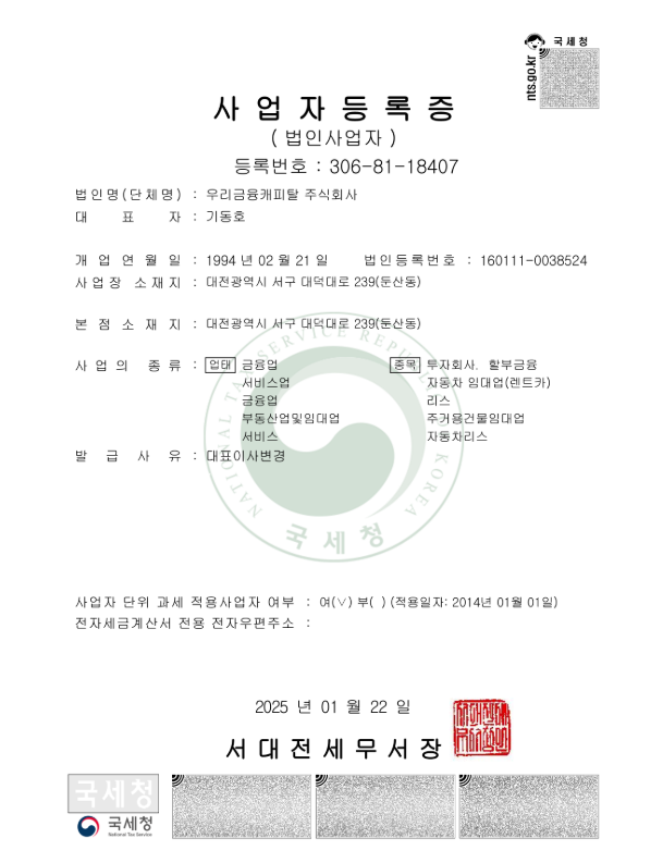우리금융캐피탈 사업자등록증 > 우리금융캐피탈 주요자료