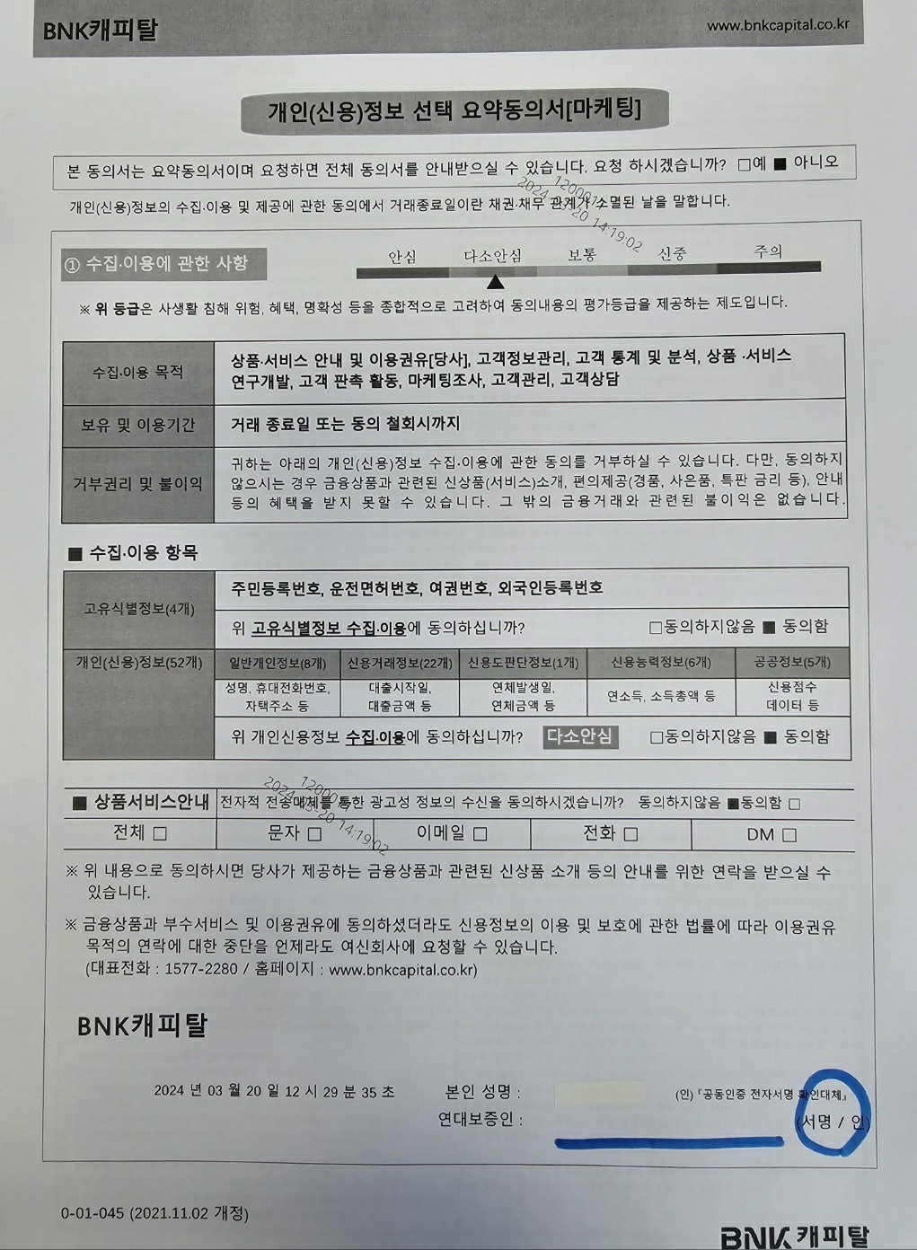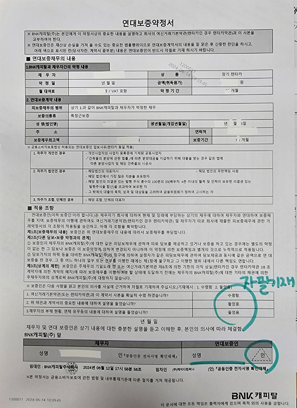 BNK캐피탈 연대보증인 계약서 예시본과 개인(신용)정보 선택 요약동의서입니다