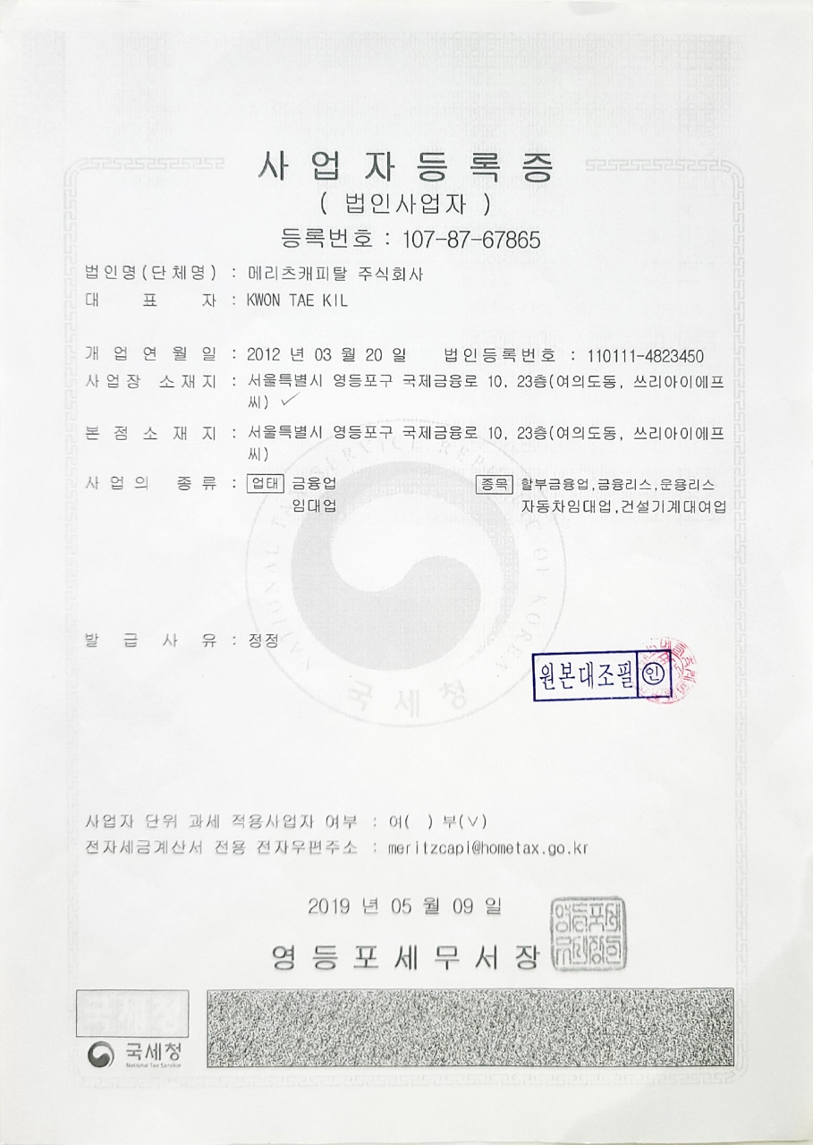 메리츠 캐피탈 사업자등록증-계산서.질권설정(렌트,리스)동일합니다. > 메리츠캐피탈 주요자료