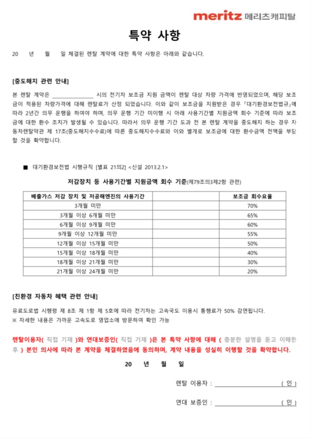메리츠 캐피탈 전기차 특약 확약서입니다.