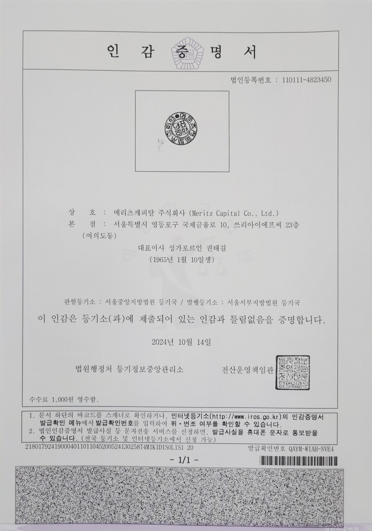 메리츠캐피탈 법인 인감증명서입니다. > 메리츠캐피탈 주요자료