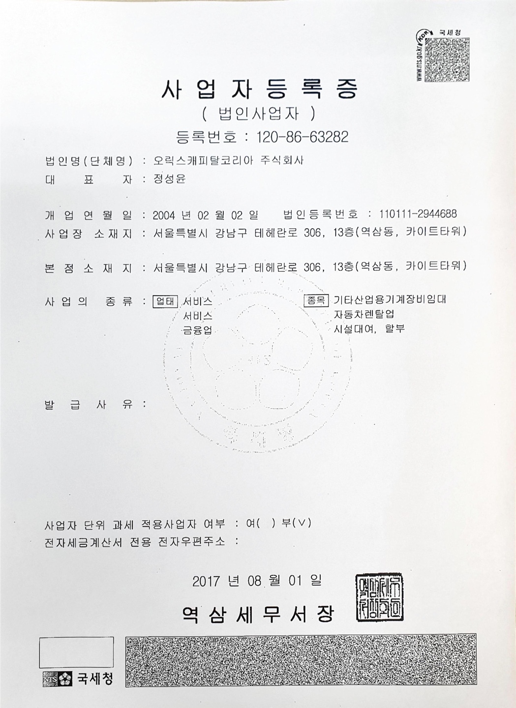 오릭스 캐피탈 사업자등록증입니다