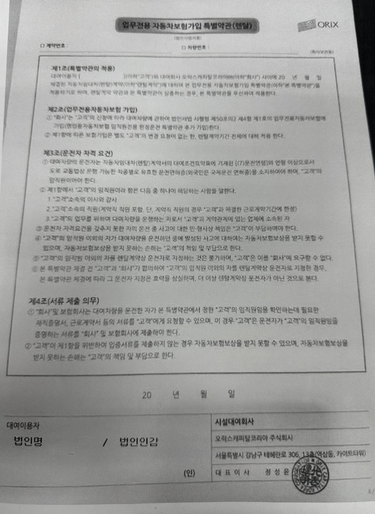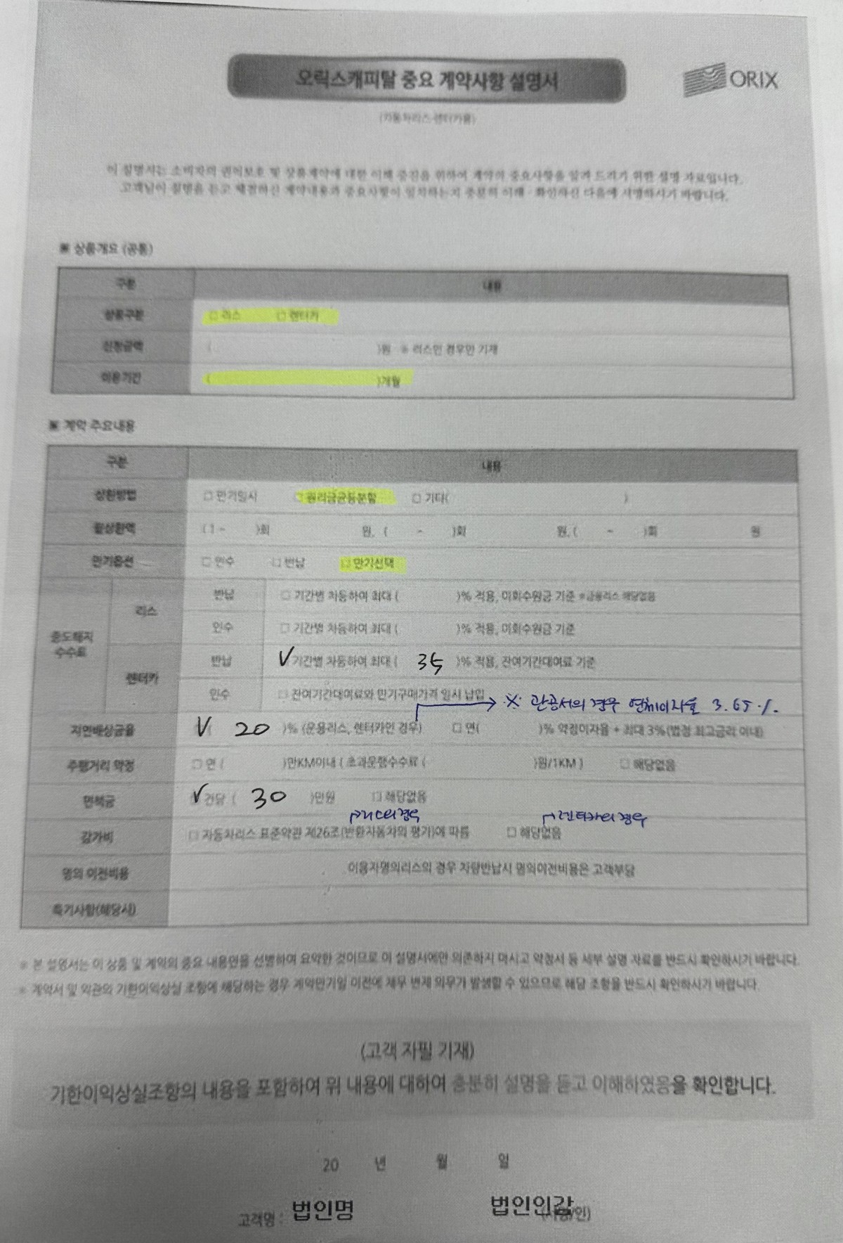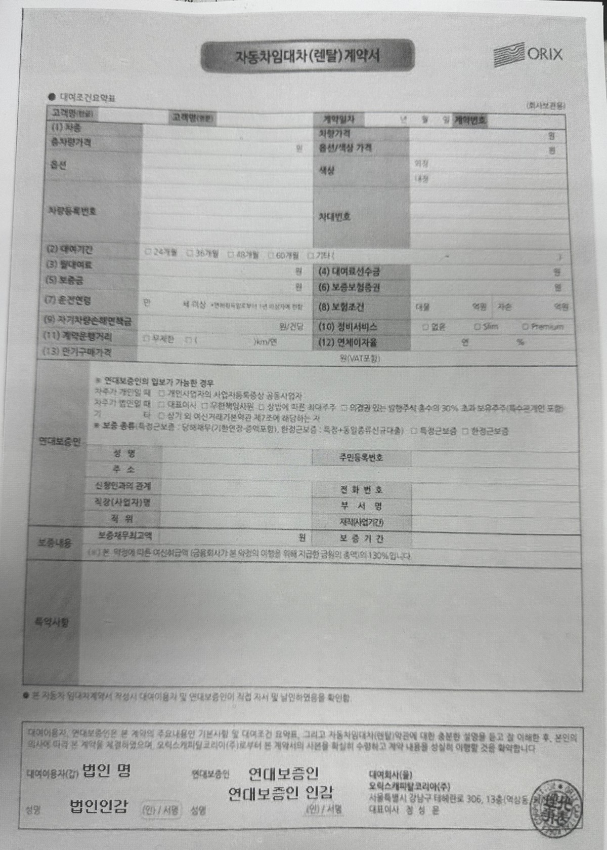 오릭스캐피탈 법인 약정서 작성 예시본입니다.