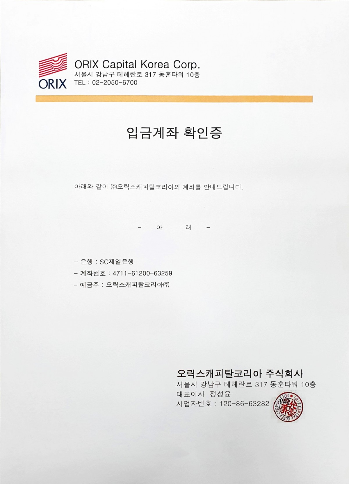 오릭스 캐피탈 보증금 입금계좌입니다. > 오릭스캐피탈 주요자료
