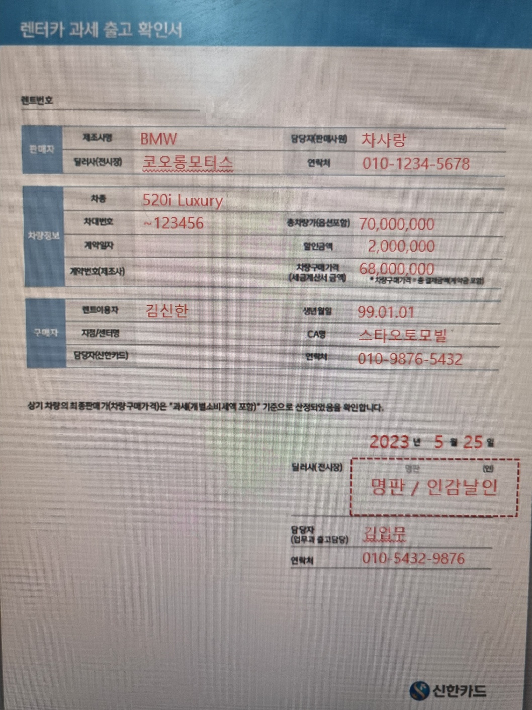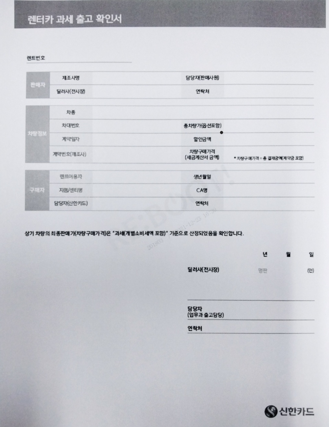 신한카드 렌트카 과세출고 확인서 예시본입니다.