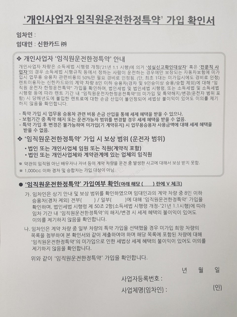 개인사업자 임직원운전한정특약 가입 확인서 > 신한카드 주요자료