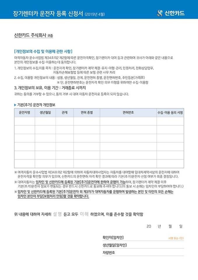 신한카드 렌트 운전자등록 신청서 입니다.