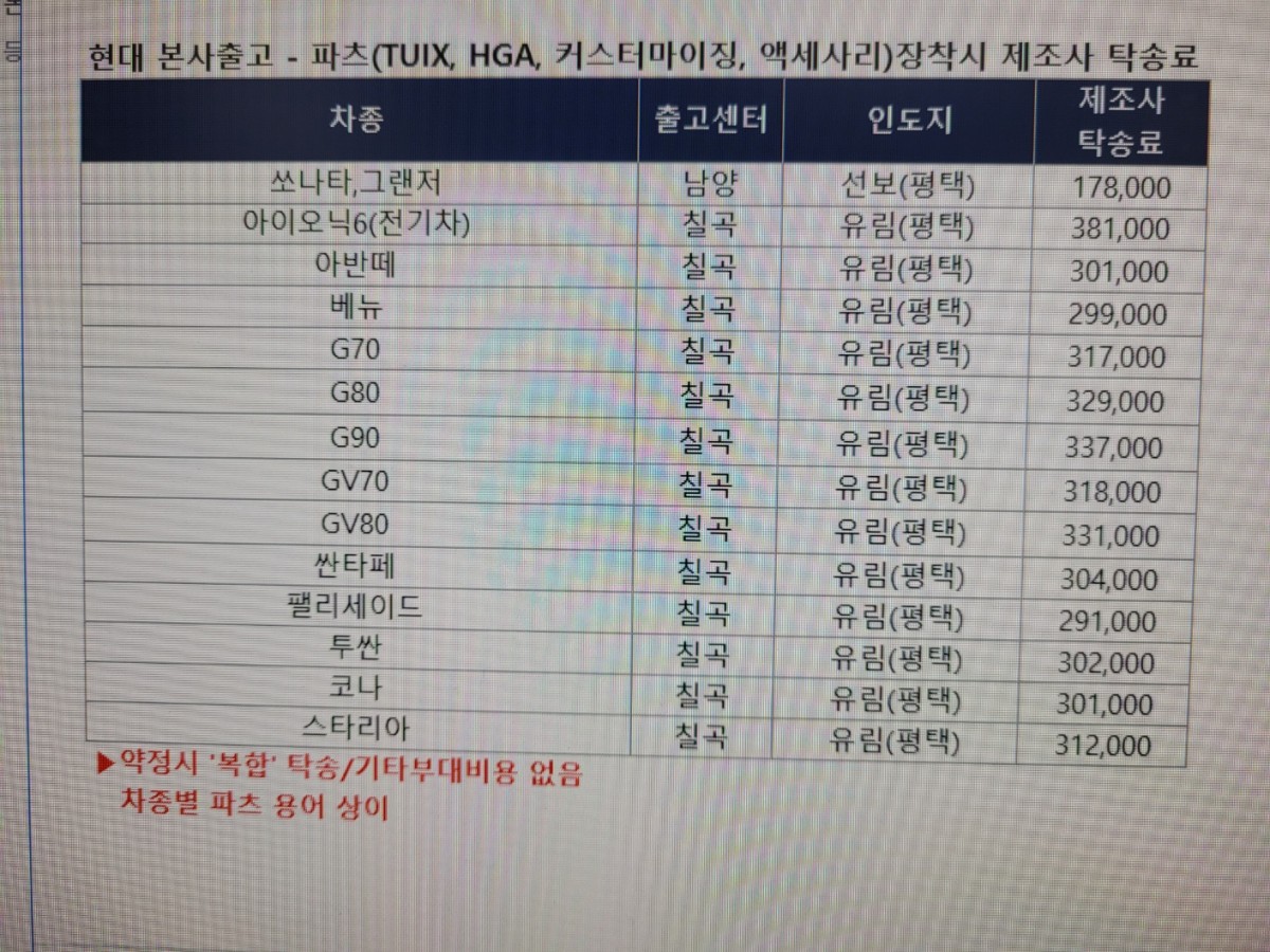 신한카드 렌트 파츠(TUIX, HGA, 커스터마이징, 액세사리) 장착시 제조사 탁송료