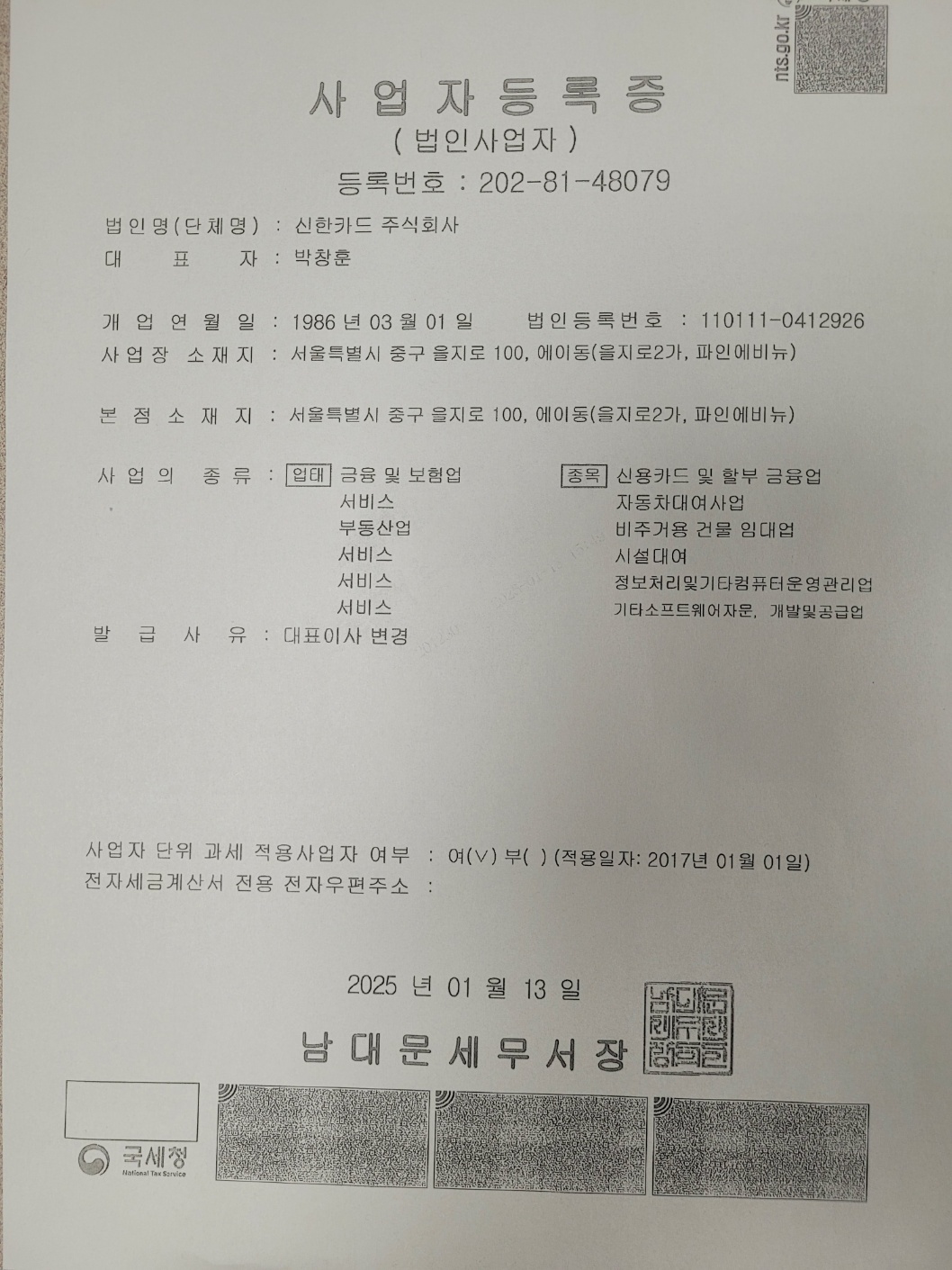 신한카드 사업자 등록증입니다. > 신한카드 주요자료