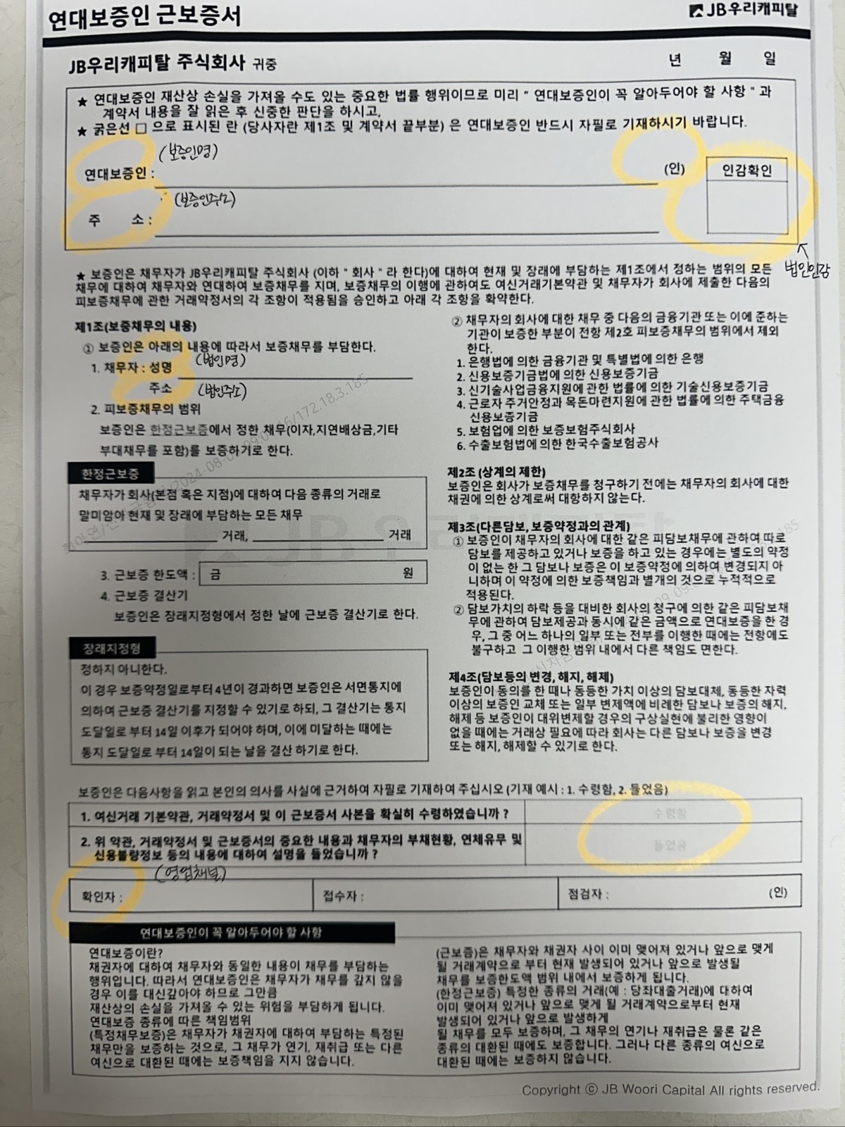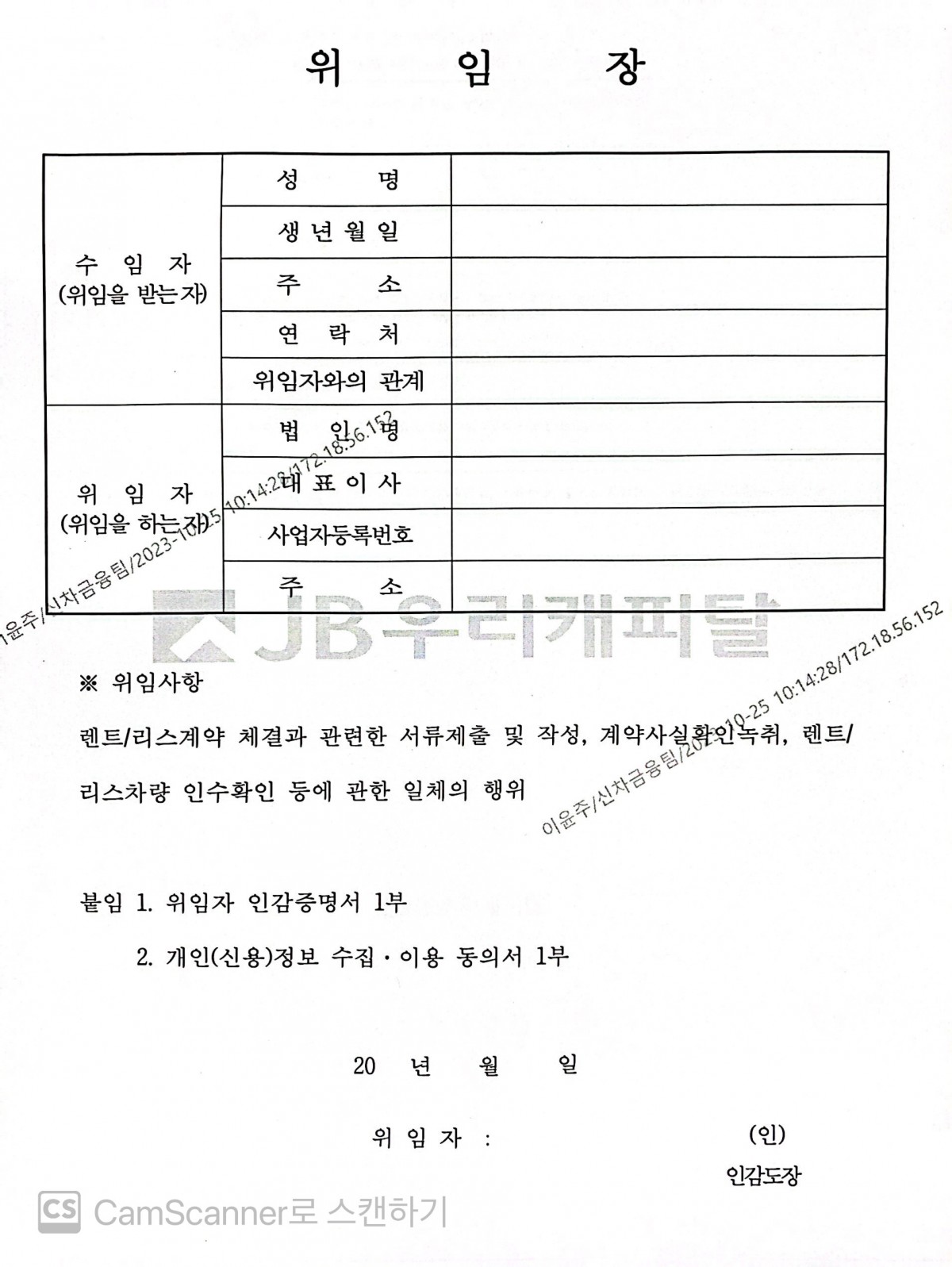 JB우리캐피탈 법인 전자약정 시 필요서류와 근보증서와 위임장입니다
