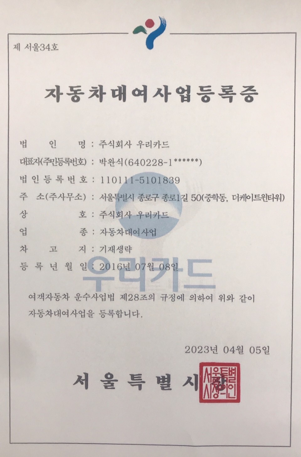 우리카드 자동차대여사업자등록증 입니다 > 우리카드 주요자료
