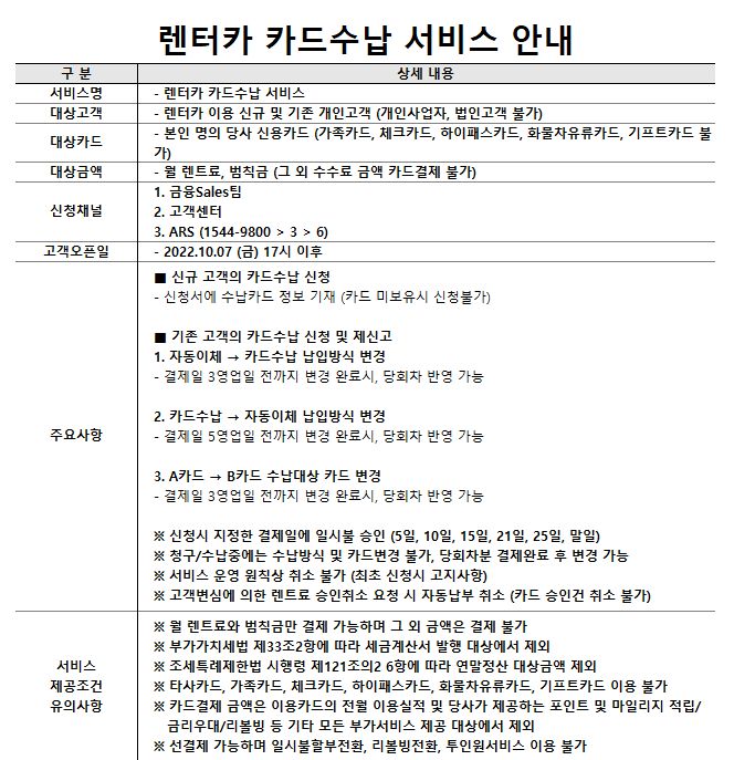 우리카드 렌터카 카드수납 서비스 안내입니다