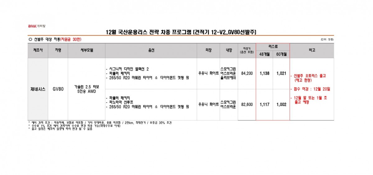| 이전글 BNK캐피탈 (리스) ★BNK캐피탈 23년12월 오토리스 견적기(V3-GV80선발주 전용) |